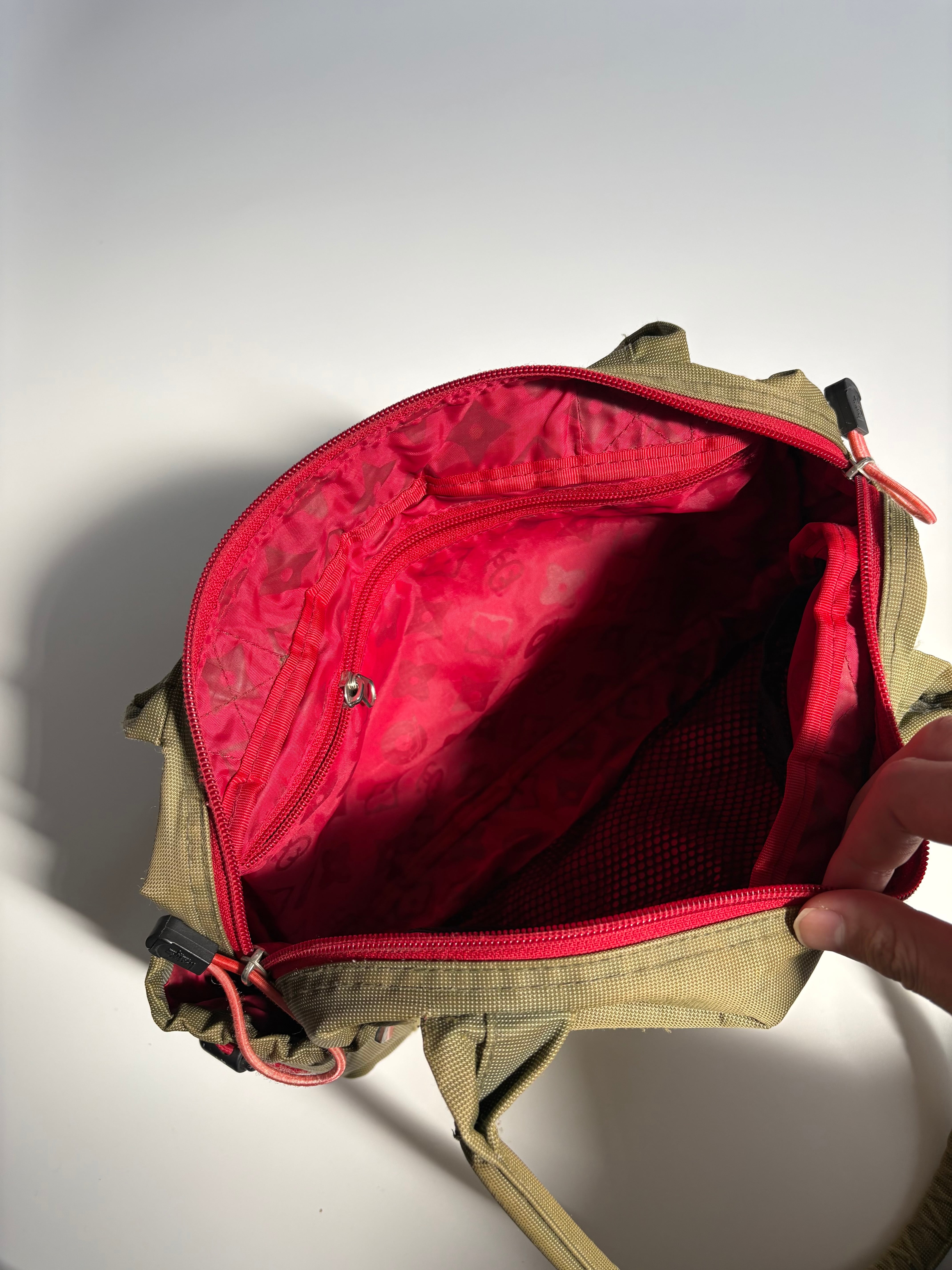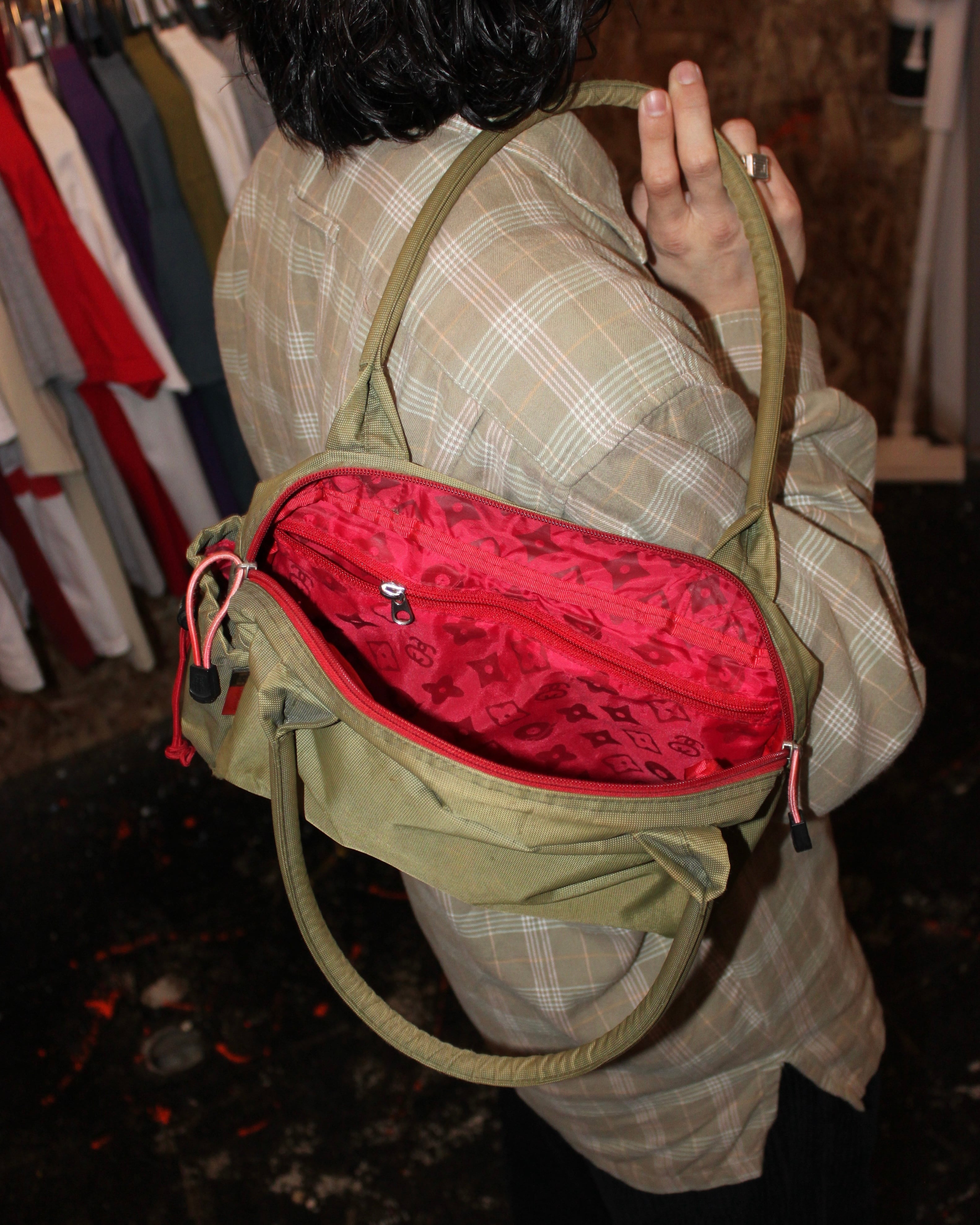 裏地が某ハイブランドの柄をサンプリングしたモノグラム柄になっているバッグ
